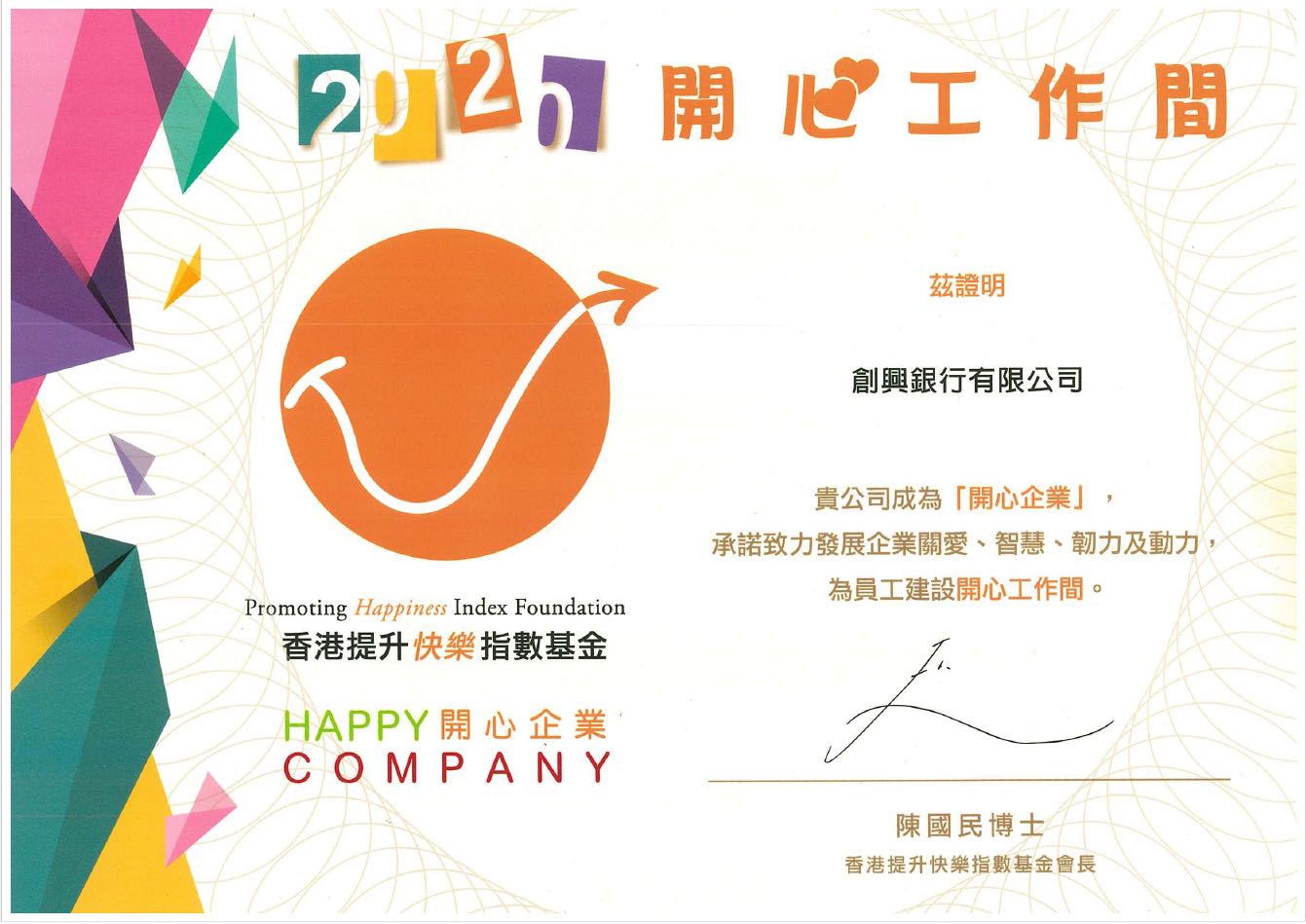 获香港生产力促进局和香港提升快乐指数基金颁发“开心企业”标志;