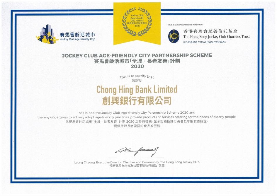 参与“赛马会龄活城市‘全城.长者友善’计划2020”并获颁标志认可;