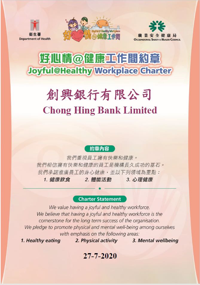 签署由卫生署、劳工处及职业安全健康局举办的“好心情@健康工作间”约章;