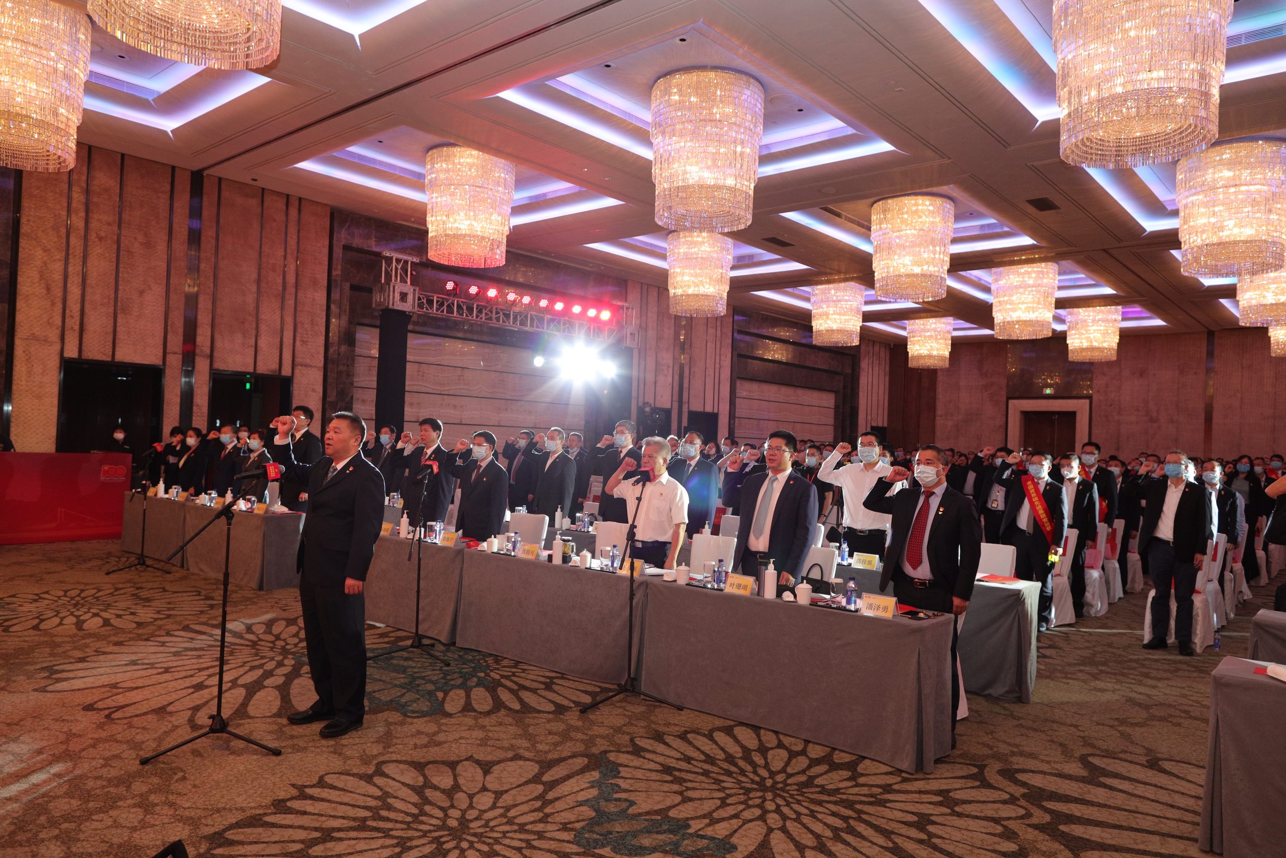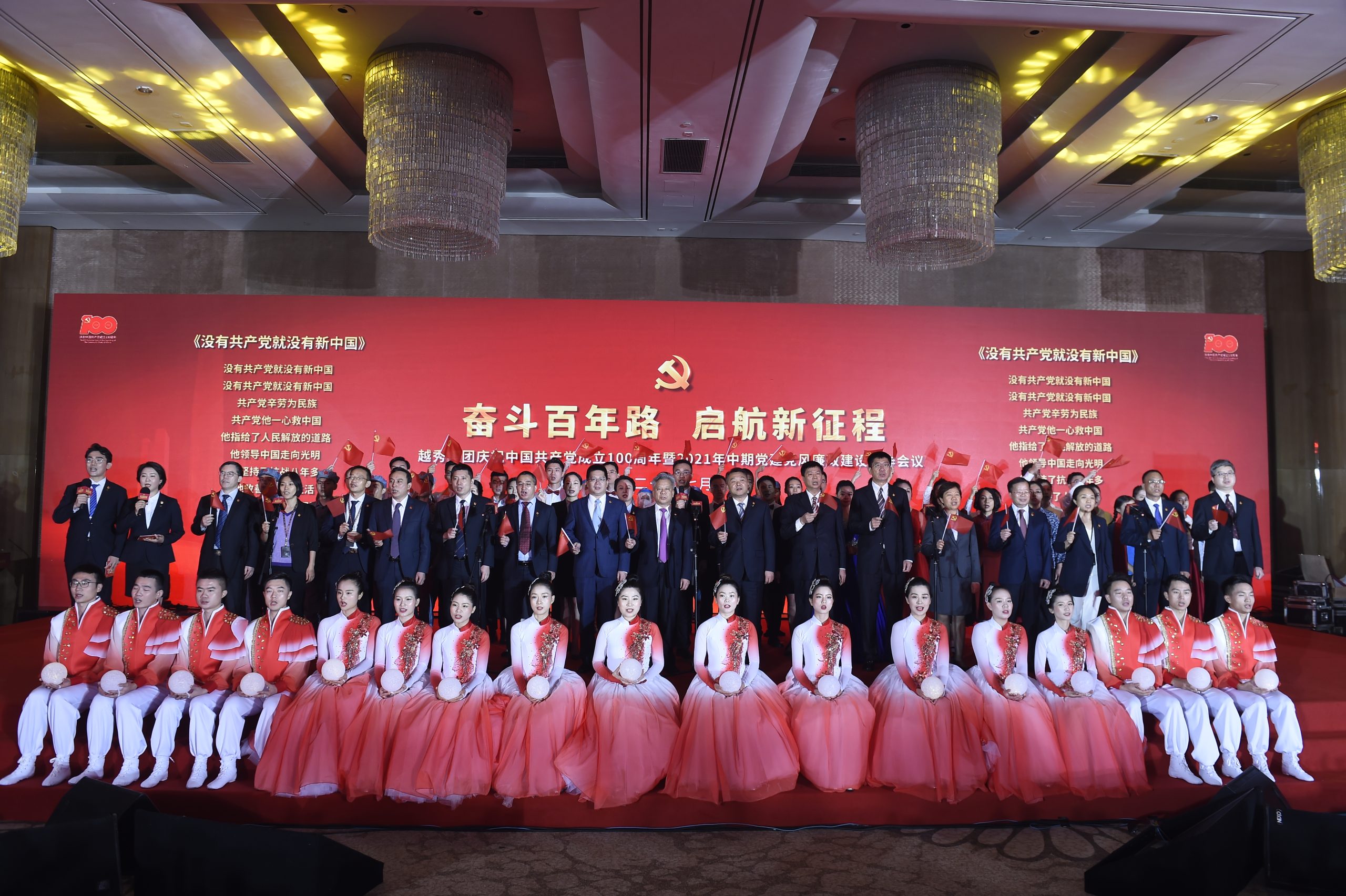 会议结束后进行了红色诵读展演,来自集团总部及下属5个板块的员工代表通过舞台剧、情景演绎、诗朗诵相结合等方式,将红色故事、抗疫事迹以及对党和祖国的祝福搬上舞台。大会在全体与会人员合唱《没有共产党就没有新中国》的歌声中落下帷幕。