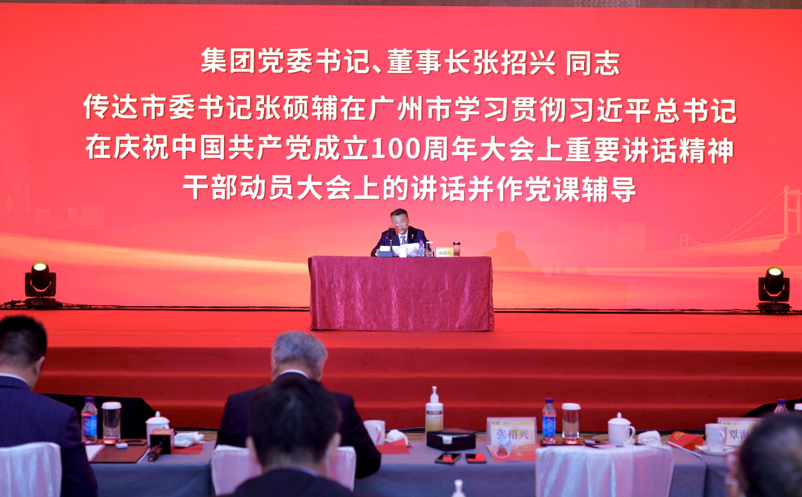 集团党委书记、董事长张招兴在会上传达了市委书记张硕辅在广州市学习贯彻习近平总书记在庆祝中国共产党成立100周年大会上重要讲话精神干部动员大会上的讲话精神,对集团上下学习贯彻习近平总书记“七一”重要讲话精神进行了动员部署,要求将学习好、宣传好、贯彻好总书记重要讲话精神作为当前和今后一个时期的头等大事和重大政治任务,迅速兴起学习宣传贯彻热潮。同时,张招兴同志结合党史学习教育学习体会,以《充分汲取百年党史智慧力量